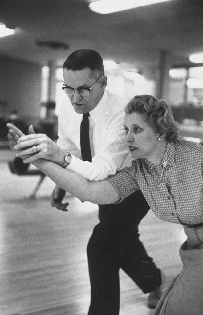 George P. Smith of Scioto Lanes in Columbus, Ohio, taught novice, Mrs. Jane Brown, the proper technique of releasing a bowling ball, 1960.