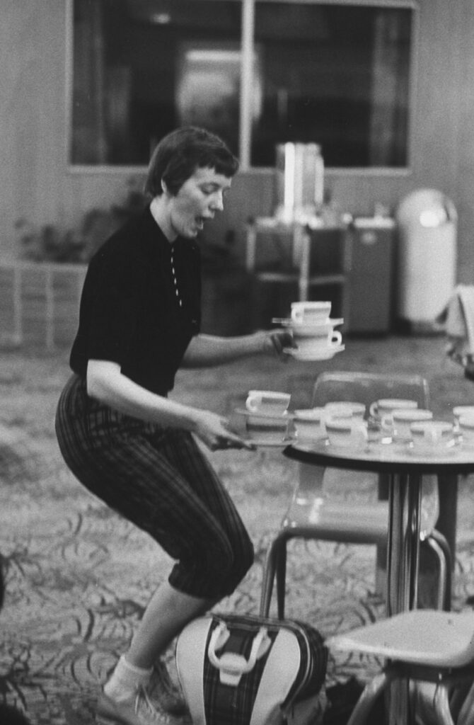 Mary Loopo juggled cups of coffee that she was bringing to her teammates at a bowling alley in Columbus, Ohio, 1960.