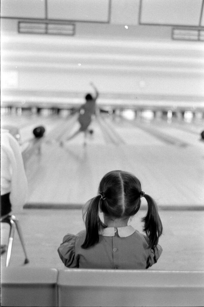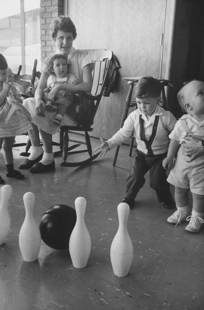 Girls played while their mothers competed in a bowling league in Milwaukee, 1960.