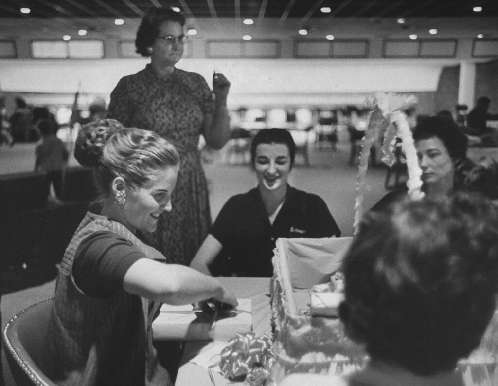 A bowling alley baby shower marked the departure of a member of the Baptist Women’s League in Dallas, 1960.