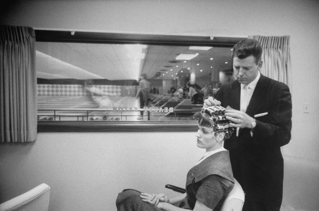 A beauty shop adjoined Cotton Bowl lanes in Dallas for benefit of women bowlers who wanted to have their hair set between games, Dallas, 1960.